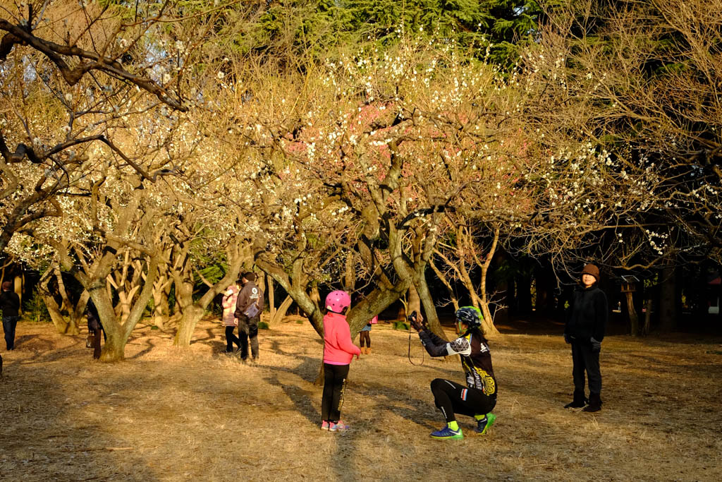 夕暮れの公園、梅の木の下で写真を撮っている親子