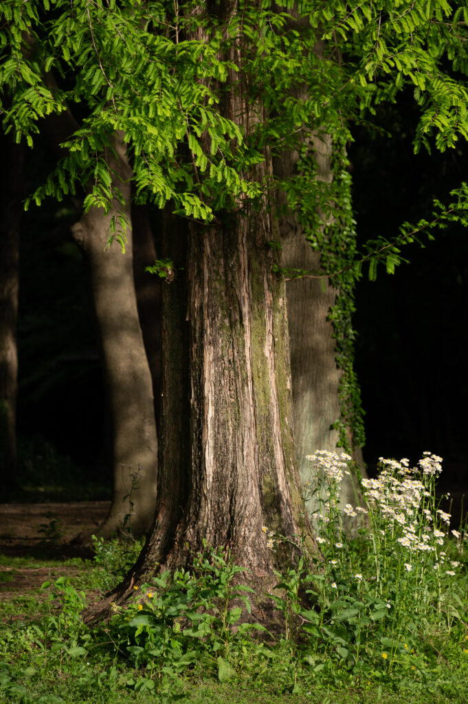 大きな木に寄り添うように咲く花。