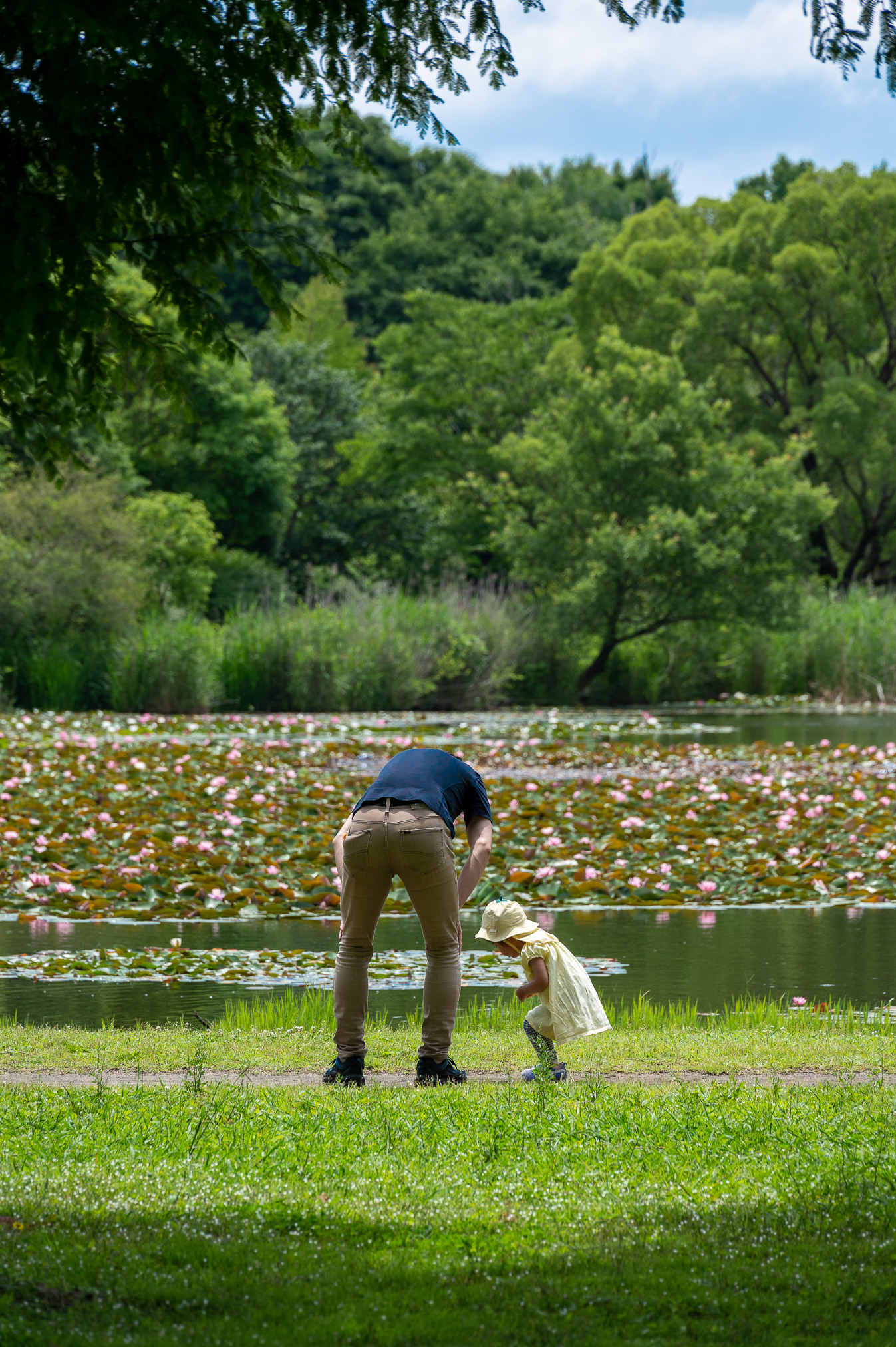 写真は何かをのぞき込む親子